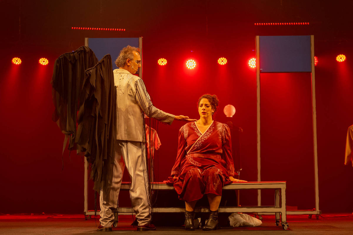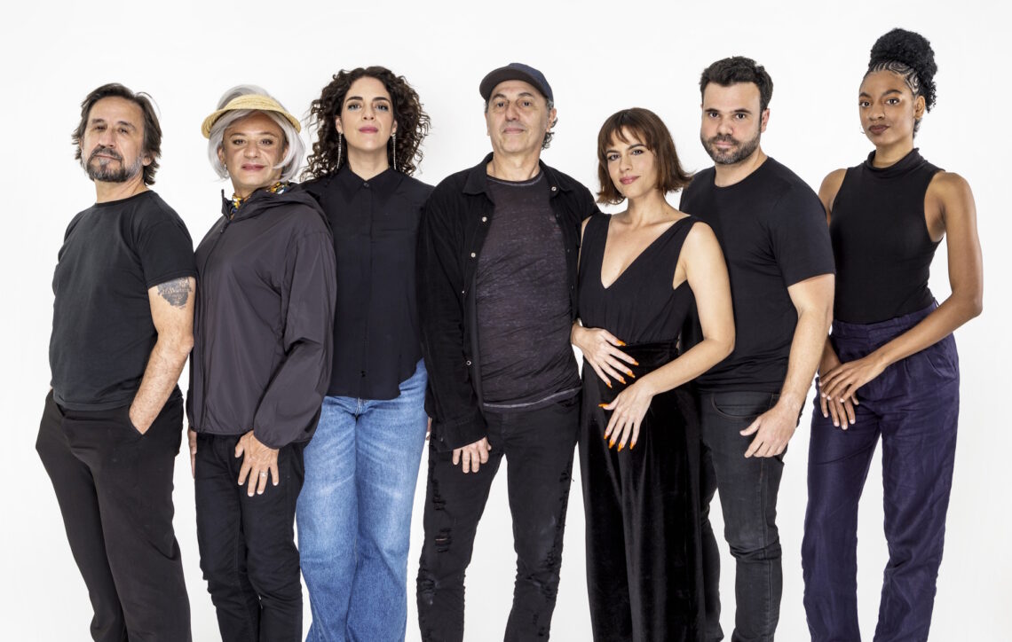 A encenação de Dani Angelotti compreende esse princípio e constrói um espetáculo em que as linguagens se articulam com precisão. A música não funciona como comentário externo, mas como estrutura interna da cena. A presença de Zeca Baleiro — responsável pela direção musical e também em cena — reforça essa integração. Sua atuação não se impõe como protagonismo deslocado, mas como elemento organizador do ritmo e da atmosfera do espetáculo, em diálogo constante com o elenco e com a percussionista Layla Silva. Música, dramaturgia e atuação operam como partes de uma mesma engrenagem.