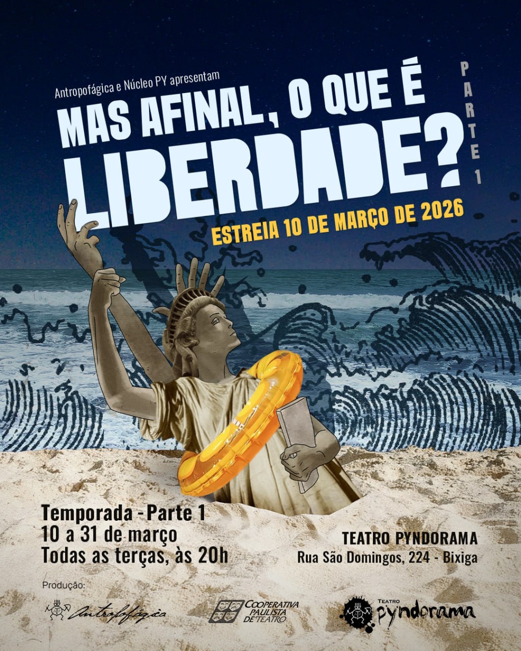 Há uma inversão elegante no ponto de partida do Núcleo Py, da Companhia Antropofágica, ao revisitar Liberdade, Liberdade, de Millôr Fernandes e Flávio Rangel. O texto original, de 1965, foi montado por habitantes do Leblon que se passavam por trabalhadores. A nova versão — renomeada Mas afinal, o que é Liberdade? para, segundo o release, lidar com os “modelos de censura vigentes” — inverte o dispositivo: são trabalhadores que fingem estar no Leblon. A distinção não é cosmética. É uma tomada de posição sobre quem tem o direito histórico de falar sobre liberdade, e de onde. Que essa moldura se sustente durante todo o espetáculo, num Teatro Pyndorama com cenografia minimalista — alguns elementos que evocam praia, banquinhos, a despretensão calculada de um luau — é o primeiro mérito da encenação.