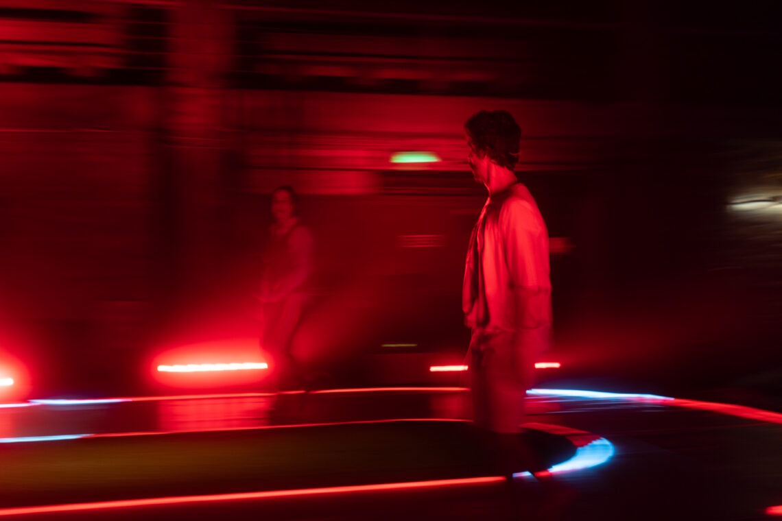 Em Pés-Coração, o público é convidado a subir ao palco e percorrer, em fila, duas pistas circulares paralelas. A imagem projetada desse deslocamento coletivo desenha na tela o símbolo do infinito, transformando a caminhada partilhada em figura visual antes que em argumento. Há uma aposta clara nessa abertura: a experiência precede a explicação. Não se trata de ilustrar uma tese sobre deslocamento — trata-se de fazer o espectador habitá-lo com o próprio corpo, ainda que numa versão miniaturizada e controlada, a poucos metros do cotidiano da cidade.